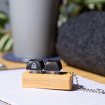 Conçu en bambou naturel avec une chaînette en métal, il intègre deux boutons en ABS recyclé qui rappellent les touches d’un clavier mécanique, parfaits pour soulager le stress en toute discrétion.